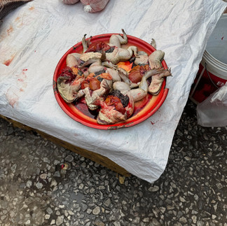 Steve's favorites are the "you wouldn't find that at home" section. This included lots of buffalo skin, some fried and dried mushrooms (which we tried and were yummy) and an exotic selection of meats. Si's usual response to "How would you eat that?" was "Add some garlic, a little lemon grass, makes a good soup". Shown below (if you're squeamish please skip ahead) the half pigs heads, disemboweled bullfrogs and in pic #3, a dead chicken and, confirmed by Si, GRILLED RATS! AAAAAAAAAAH!!!!!!